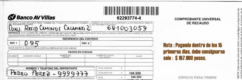 2. Esta cuenta es de recaudo nacional, pudiendo realizarse el pago en cualquier sucursal bancaria de AV VILLAS en Bogotá u otra ciudad de Colombia.